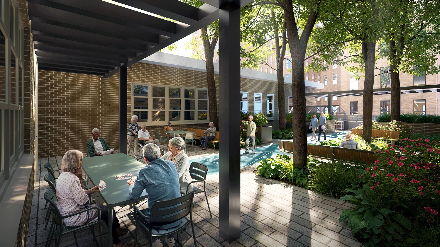 White Houses is also listed on the National Register of Historic places, as the development was NYCHA’s first senior-only building. The rehabilitation must preserve the spirit of the original design at the campus. White Houses’ heat and hot water systems will be modernized, including with new electric packaged terminal heat pumps (PTHP) in every apartment to improve efficiency and reliability. The on-site laundry facility will be restored to service, community center facilities and the tenant association office will be upgraded, and a new on-site management office will be built out on the ground floor. Outdoor upgrades will include new landscaping, improved and additional seating, fresh paving, and expanded shading structures.